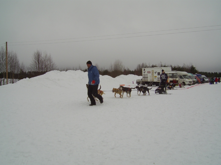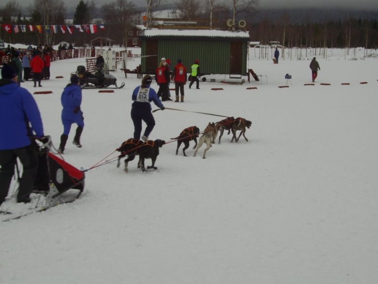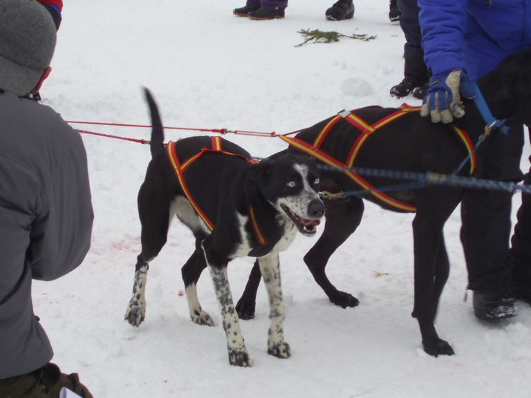 Tag 1 - Starts der 6-Hunde-Klasse, stahlblaue Augen als Beweis für das Huskyerbe trotz Schlappohren und Warten auf das entscheidende "GO"...
